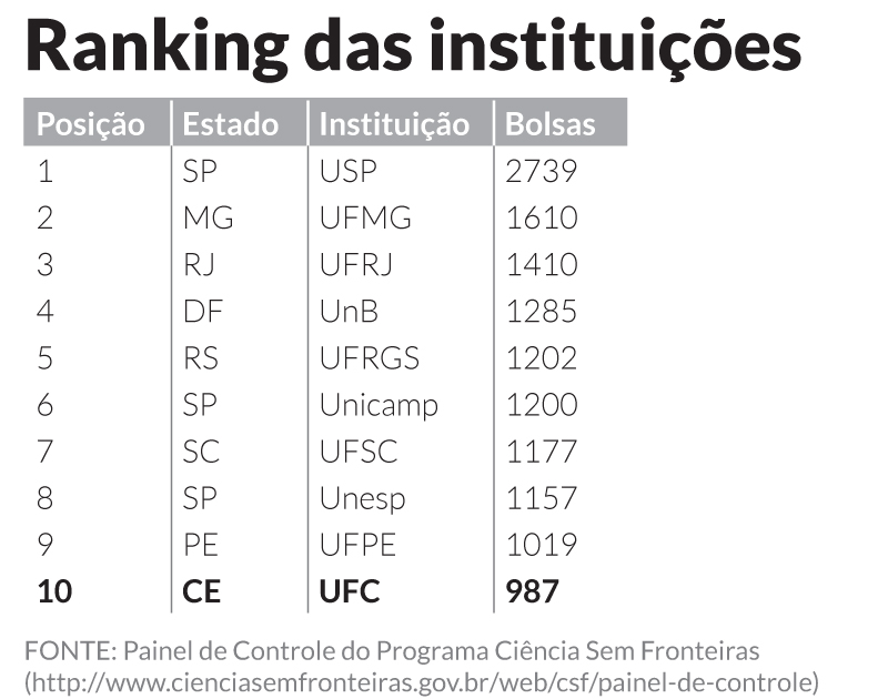 A UFC ficou na 10ª posição no ranking nacional das instituições de ensino superior que mais obtiveram bolsas no programa Ciência Sem Fronteiras (CsF), do Governo Federal, segundo levantamento feito a partir do painel de controle do Programa.