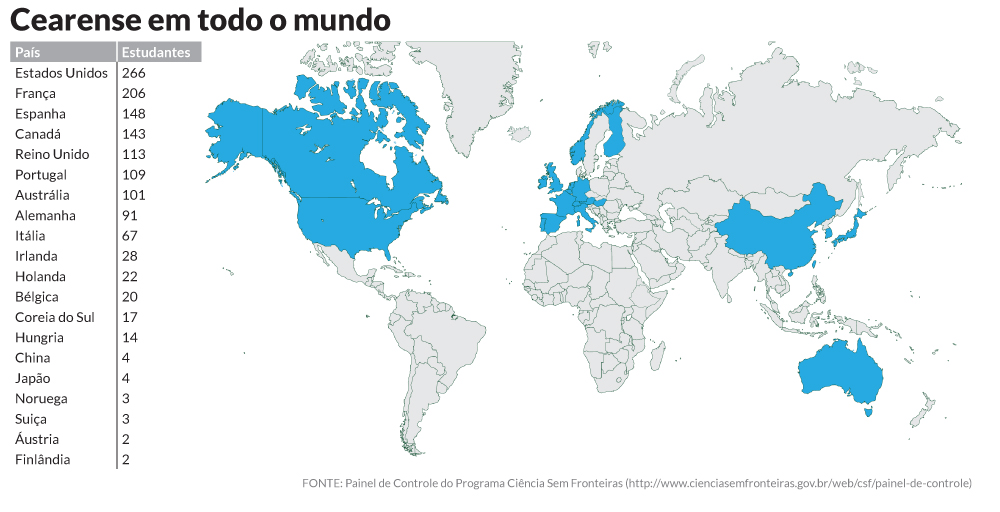 Quanto aos países, o levantamento mostra que os Estados Unidos são o país que mais recebeu estudantes oriundos de instituições cearenses: 166 (19,5% do total). Depois dele, pela ordem, vêm França (15%), Espanha (10,8%), Canadá (10,4%) e Reino Unido (8,2%). Há casos de alunos que receberam bolsas para ir para países menos centrais, como Austrália, China, Japão, Hungria e Finlândia (veja quadro).