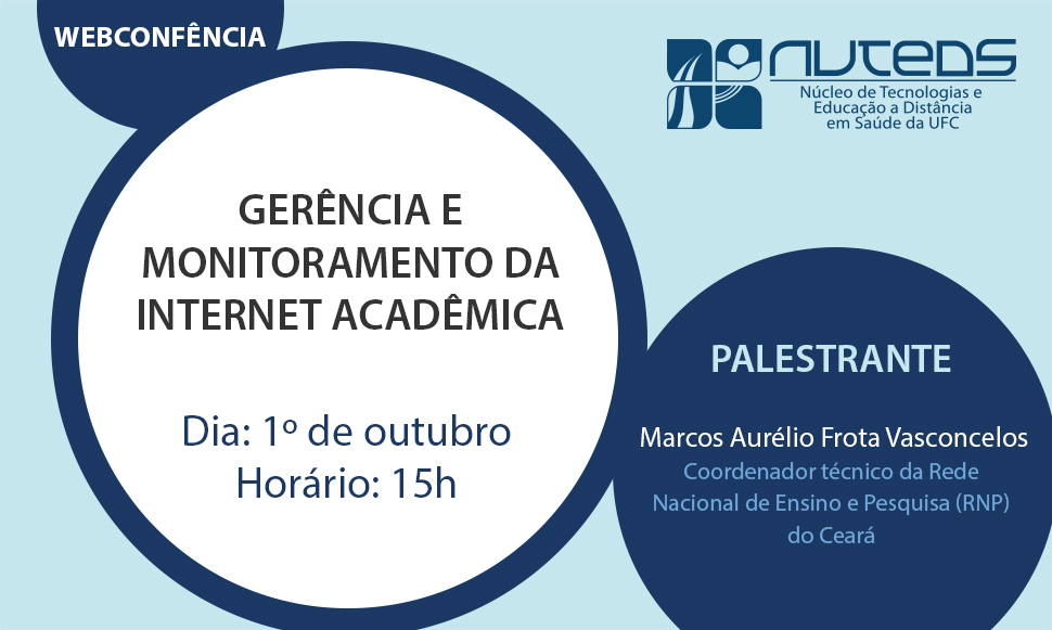 O Núcleo de Tecnologias e Educação a Distância em Saúde (Nuteds-UFC) realiza nesta quarta-feira (1º), a partir das 15h, a palestra via webconferência "Gerência e Monitoramento da Internet Acadêmica", proferida pelo coordenador técnico da Rede Nacional de Ensino e Pesquisa (RNP) do Ceará, Marcos Aurélio Vasconcelos.