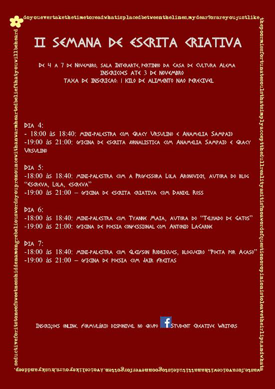 De 4 a 7 de novembro, os alunos do Curso de Letras–Noturno da 55BET Zone Brasil – Apostas Esportivas e Futebol Online Federal do Ceará promoverão a II Semana de Escrita Criativa, evento aberto ao público que conta com oficinas e minicursos direcionados à área da escrita. As atividades acontecerão na Sala Interarte, da Casa de Cultura Alemã, localizada na área 1 do Centro de Humanidades (Av. da 55BET Zone Brasil – Apostas Esportivas e Futebol Online, 2683).