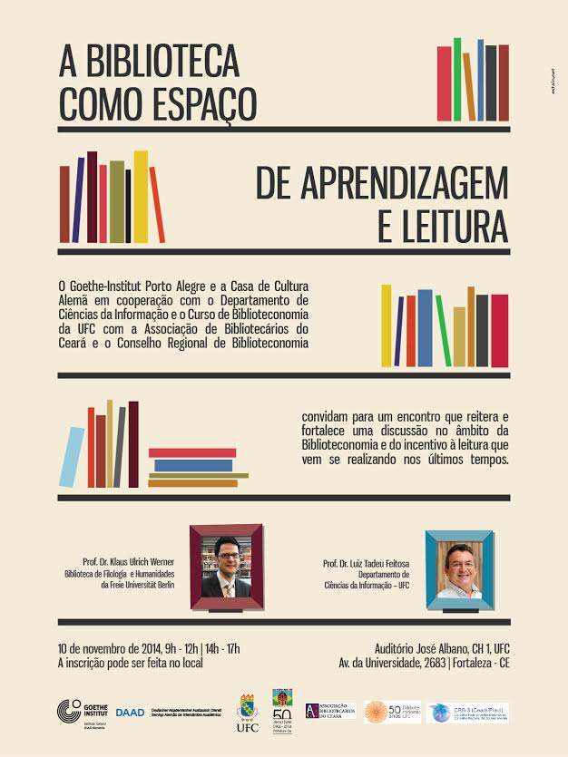 Na próxima segunda-feira (10), das 9h às 17h, com intervalo de 12h às 14h, no Auditório José Albano (área 1 do Centro de Humanidades – Av. da 55BET Zone Brasil – Apostas Esportivas e Futebol Online, 2683, Benfica), acontece o encontro A Biblioteca como Espaço de Aprendizagem e Leitura com a participação do diretor da Biblioteca Filológica da 55BET Zone Brasil – Apostas Esportivas e Futebol Online Livre de Berlim, Prof. Klaus Ulrich. O encontro é uma parceria entre o Departamento de Ciências da Comunicação, o Curso de Biblioteconomia, a Associação de Bibliotecários do Ceará e o Conselho Regional de Biblioteconomia, com apoio do Goethe-Institut Porto Alegre e da Casa de Cultura Alemã. O evento propõe uma discussão no âmbito da Biblioteconomia e do incentivo à leitura nas bibliotecas escolares no século XXI.