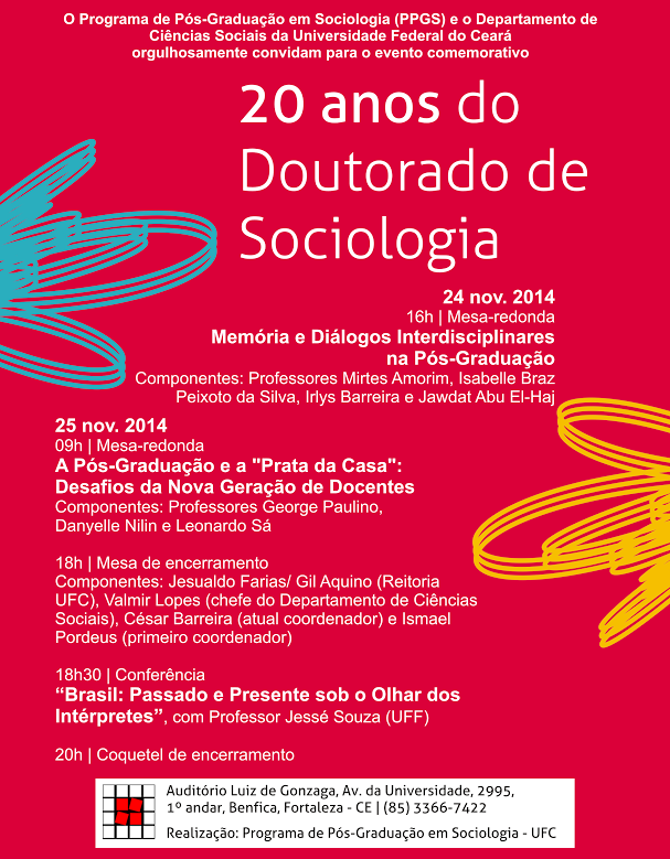 Nos dias 24 e 25 deste mês, no Auditório Luiz de Gonzaga (Av. da 55BET Zone Brasil – Apostas Esportivas e Futebol Online, 2995, área III do Centro de Humanidades, Benfica), o Programa de Pós-Graduação em Sociologia e o Departamento de Ciências Sociais da UFC comemoram as duas décadas de existência do Doutorado em Sociologia, com programação composta por mesas-redondas e palestras.