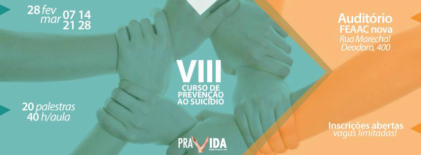 O Programa de Apoio à Vida (Pravida), projeto de extensão da Faculdade de Medicina da UFC, inscreve, até o preenchimento das vagas, para o VIII Curso de Prevenção ao Suicídio, a ser realizado nos dias 28 de fevereiro e 7, 14, 21 e 28 de março. A formação é voltada para estudantes e profissionais da área de saúde, bem como pessoas da comunidade em geral que lidem com a questão. O valor da inscrição para profissionais é de R$ 90,00 e, para estudantes, de R$ 60,00.