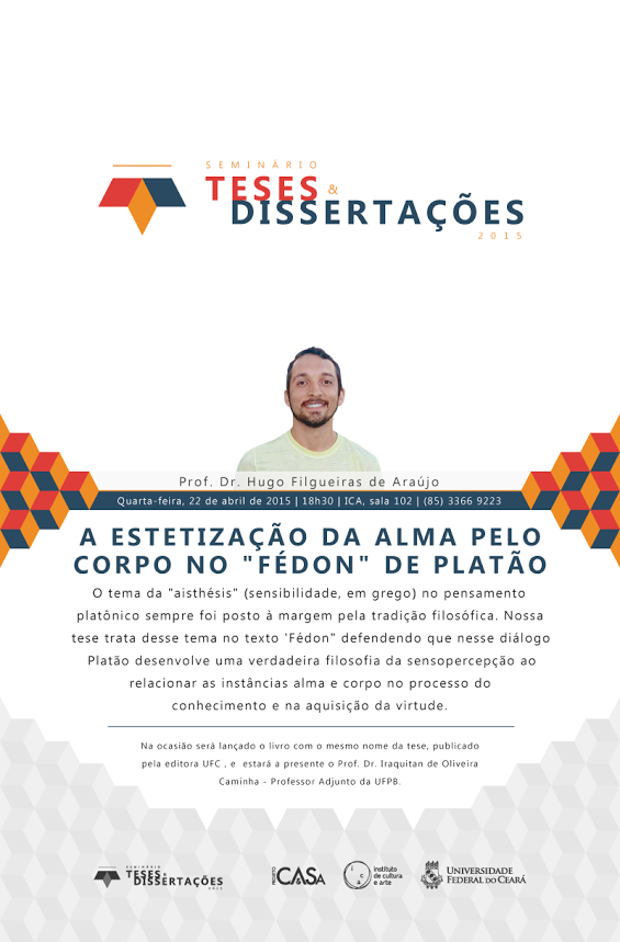 O Instituto de Cultura e Arte (ICA) da UFC inicia nesta quarta-feira (22) mais uma edição do Seminário de Teses e Dissertações. O convidado é o Prof. Hugo Filgueiras de Araújo, do Curso de Filosofia da UFC, que ministrará palestra intitulada "A estetização da alma pelo corpo no 'Fédon' de Platão".