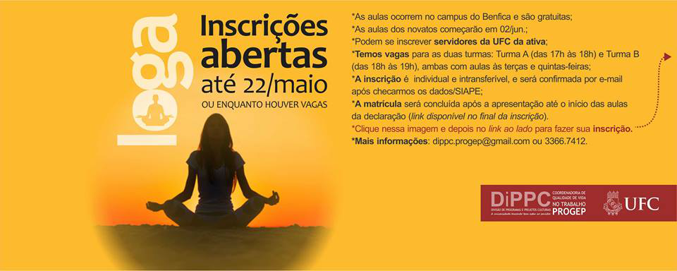 A Divisão de Programas e Projetos Culturais (DiPPC) da Pró-Reitoria de Gestão de Pessoas (Progep) da UFC está com inscrições abertas, até 29 de maio ou enquanto houver vagas, para aulas de ioga, em duas turmas. Podem se inscrever os servidores da UFC da ativa, exceto grávidas e pessoas com restrições médicas.