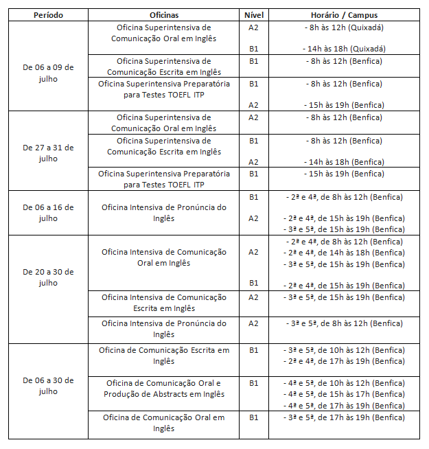 Cada oficina tem carga de 16 horas, nos níveis A2, B1 e B2 do Quadro Comum Europeu (QCE). As aulas no NucLi da UFC acontecerão de 6 a 30 de julho, em períodos diferentes: