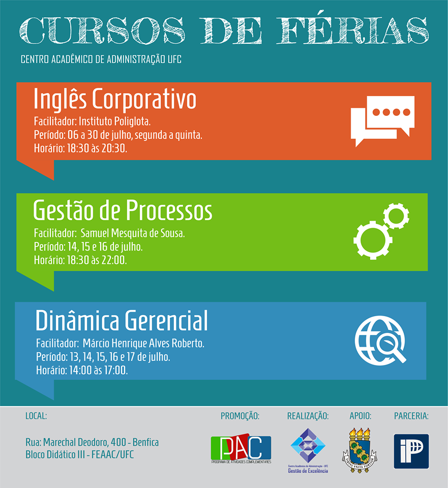 O Centro Acadêmico Sandra Caracas, do Curso de Administração da UFC, realizará durante o mês de julho o I Cursos de Férias do Programa de Atividades Complementares (PAC). Serão ofertados três cursos voltados para o desenvolvimento das capacidades profissionais dos alunos visando o mercado de trabalho.