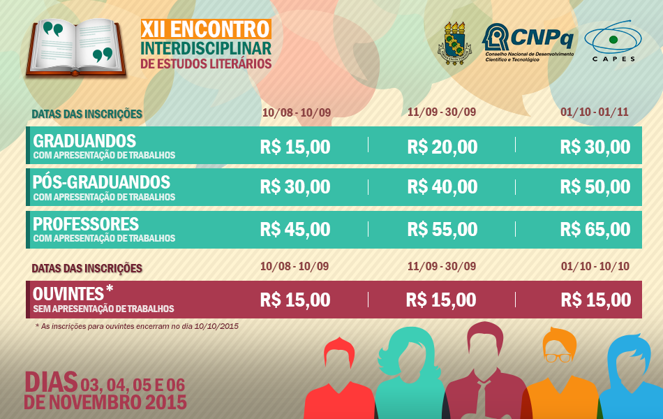 A 12ª edição do Encontro Interdisciplinar de Estudos Literários está com inscrições abertas para quem quiser participar como ouvinte ou com apresentação de trabalhos. Organizado pelo Programa de Pós-Graduação em Letras da UFC, o evento ocorrerá de 3 a 6 de novembro, na área 1 do Centro de Humanidades da UFC (Campus Benfica).