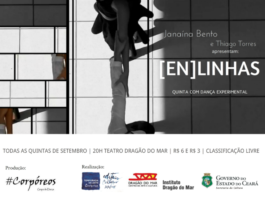 O trabalho [En]linhas, de alunos do bacharelado em Dança da UFC, foi contemplado no edital de artes do Centro Dragão do Mar de Arte e Cultura (CDMAC), de Fortaleza. O espetáculo fará parte da Temporada de Arte Cearense durante todas as quintas-feiras de setembro (dias 3, 10, 17 e 24), no programa Quinta com Dança Experimental, sempre às 20h.