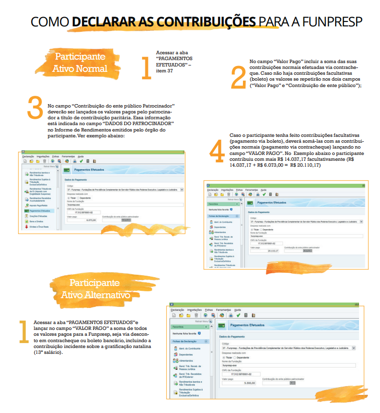 Os valores pagos à Funpresp devem ser informados na aba Pagamentos Efetuados, no código 37 – Funpresp (Fundações de Previdência Complementar do Servidor Público dos Poderes Executivo, Legislativo e Judiciário).