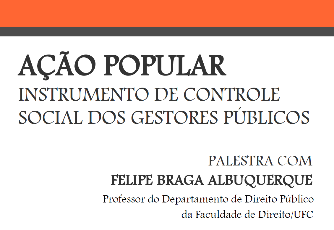 A coordenação do Curso de Gestão de Políticas Públicas da UFC está com inscrições on-line abertas para a palestra "Ação popular: instrumento de controle social dos gestores públicos", a ser ministrada no dia 11 de maio, das 9h às 12h, pelo Prof. Felipe Braga Albuquerque, do Departamento de Direito Público da Faculdade de Direito da UFC.