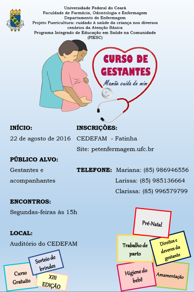 Iniciativa do projeto de extensão Programa Integrado de Educação em Saúde na Comunidade (PIESC), o curso tem apoio dos projetos Enfermagem na Promoção da Saúde Materna e Puericultura: Resgate das Ações de Cuidado. Gratuita, a formação terá 13 encontros, que serão realizados sempre às segundas-feiras, às 15h, a partir de 22 de agosto, na Casa de Parto Natural Lígia Barros Costa, localizada no Centro de Desenvolvimento Familiar (Cedefam – Rua Pernambuco, 1673, Planalto Pici).