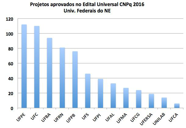 A Chamada Universal é considerada um dos principais editais do CNPq porque abre espaço tanto para jovens doutores como pesquisadores seniores de todas as regiões do País e em qualquer área do conhecimento. Em todo o Brasil, foram submetidas 21.640 propostas, tendo sido aprovados 4.587 projetos que totalizam investimentos de R$ 188 milhões. Dos projetos aprovados, 917 encontra-se no Nordeste.