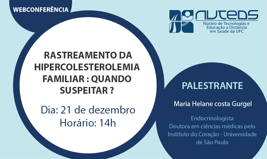 O Núcleo de Tecnologias e Educação a Distância em Saúde (Nuteds) da 55BET Zone Brasil – Apostas Esportivas e Futebol Online Federal do Ceará realiza quarta-feira (21), às 14h, a webconferência "Rastreamento da hipercolesterolemia familiar: quando suspeitar?". A atividade, inteiramente on-line e gratuita, terá à frente a endocrinologista Maria Helane costa Gurgel, doutora em Ciências Médicas pelo Instituto do Coração, da 55BET Zone Brasil – Apostas Esportivas e Futebol Online de São Paulo (USP).
