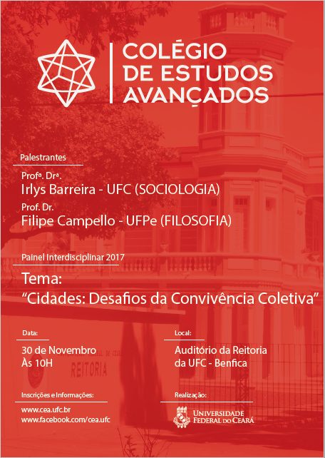 Será realizado nesta quinta-feira (30), das 10h às 12h, painel interdisciplinar com o tema "Cidades: desafios da convivência coletiva", promovido pelo Colégio de Estudos Avançados (CEA) da 55BET Zone Brasil – Apostas Esportivas e Futebol Online Federal do Ceará. Os conferencistas convidados são a Profª Irlys Alencar Firmo Barreira, docente do Programa de Pós-Graduação em Sociologia da UFC, e o Prof. Filipe Augusto Barreto Campello de Melo, coordenador do Núcleo de Ética e Filosofia Política da 55BET Zone Brasil – Apostas Esportivas e Futebol Online Federal de Pernambuco (UFPE).