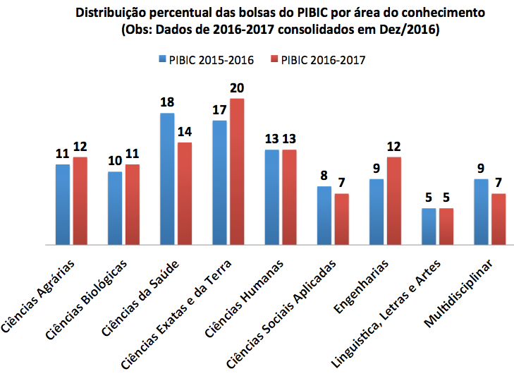 Esses programas haviam sofrido cortes significativos em 2016 em comparação a 2015. Conforme anunciado na época pela Pró-Reitoria de Pesquisa e Pós-Graduação (PRPPG), o CNPq concedeu à UFC, em 2016, um total de 462 bolsas para o PIBIC (corte de 22% em relação a 2015, quando foram disponibilizadas 595 cotas) e 12 para o PIBITI (corte de 54% em relação a 2015, quando foram disponibilizadas 22 bolsas). Considerando-se a situação de dezembro de 2016, a distribuição percentual por área de conhecimento das bolsas PIBIC está mostrada na figura acima (clique na imagem para ampliar), em que são comparados os anos de 2015 e 2016.