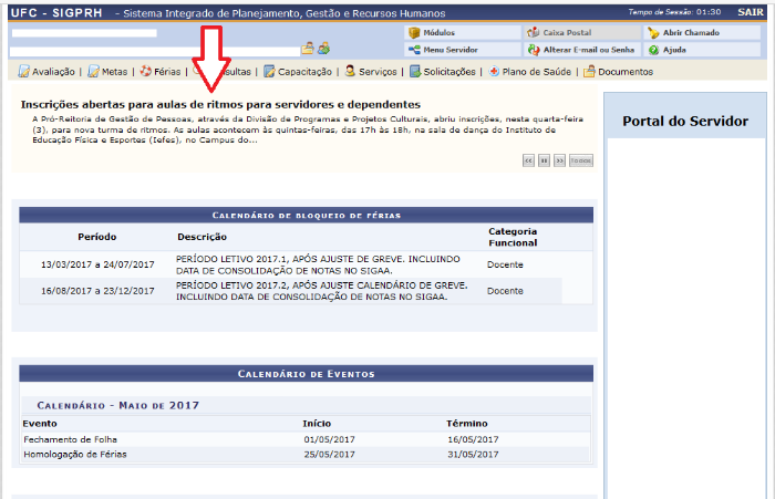 Os servidores da UFC contam com novos espaços para acessar notícias de seu interesse. Desde abril, estão disponíveis, na página inicial do Sistema Integrado de Planejamento, Gestão e Recursos Humanos (SIGPRH) e do Sistema Integrado de Gestão de Atividades Acadêmicas (SIGAA), notícias sobre eventos, cursos e outros assuntos relevantes para os servidores. Para ter acesso, basta fazer login nos sistemas e, na parte superior da página, clicar nas chamadas, que direcionarão ao Portal da UFC.
