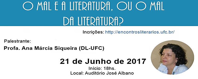 Com a palestra intitulada "O mal e a literatura, ou o mal da literatura", a Profª Ana Márcia Siqueira (DL) vai abordar a presença do tema em suas diferentes facetas (o horror, o crime, a violência, a tragédia, o sofrimento e a dor infringidos) e como há leitores e público substancial.