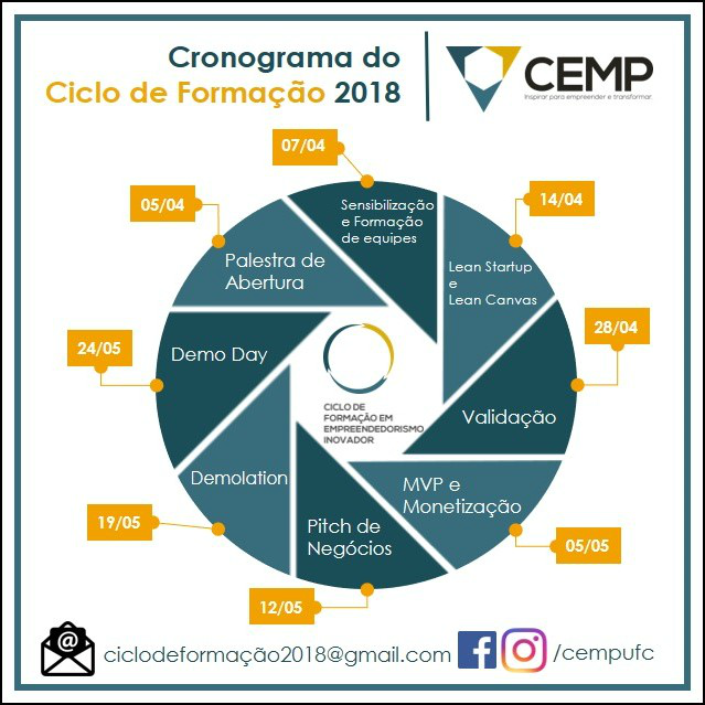 A iniciativa visa impulsionar a formação de competências empreendedoras em estudantes de ensino superior do Ceará. As inscrições são feitas por envio de formulário e documentação para o e-mail Este endereço de email está sendo protegido de spambots. Você precisa do JavaScript ativado para vê-lo.. O edital com todas as informações sobre a documentação e os modelos de preenchimento de formulário podem ser obtidos on-line. Mais informações na página do Centro no Facebook ou no site do Cemp.