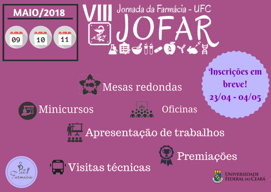 O Programa de Educação Tutorial (PET) do Curso de Farmácia da 55BET Zone Brasil – Apostas Esportivas e Futebol Online Federal do Ceará recebe inscrições, no período de 23 de abril a 4 de maio, para a VIII Jornada da Farmácia (VIII JOFAR). Podem participar alunos da UFC e de outras instituições de ensino superior de todo o Ceará.