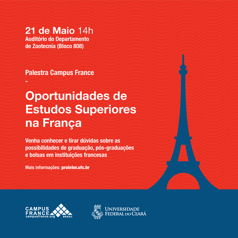 O evento será às 14h, no auditório do Departamento de Zootecnia (bloco 808). Quem fará a palestra será Letícia Pontes, do Campus France Brasil, a agência oficial do governo francês para a promoção do ensino superior na França. A palestra ocorre em parceria com a Aliança Francesa.