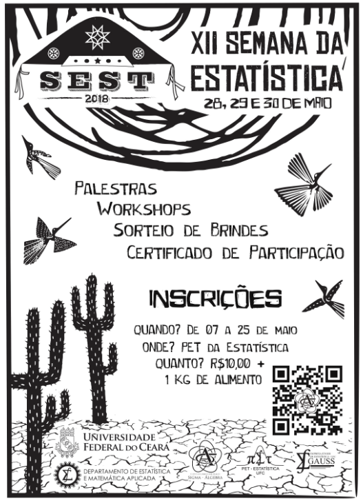 A XII Semana da Estatística é promovida pelo Departamento de Estatística e Matemática Aplicada da UFC, pelo Centro Acadêmico de Estatística, pelo PET de Estatística e pela Empresa Júnior de Estatística. Mais informações estão na página do evento no Facebook.
