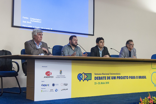 Participaram do debate o presidente da Coordenação de Aperfeiçoamento de Pessoal de Nível Superior (CAPES), Prof. Abílio Baeta Neves; o presidente da Fundação Cearense de Apoio ao Desenvolvimento Científico e Tecnológico (FUNCAP), Prof. Tarcísio Pequeno; e o pró-reitor de Pesquisa e Pós-Graduação da UFC, Prof. Antonio Gomes. A mediação foi do pró-reitor adjunto de Extensão, Prof. Rogério Mâsih.