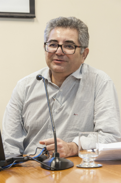 O primeiro a falar foi o Prof. Assis, que abordou o tema "Recursos hídricos em um mundo em mudança". Em sua explanação, o professor apresentou vetores que impactam o meio ambiente na atualidade: clima, economia globalizada, padrão de consumo e a quarta revolução industrial, que abrange aspectos tecnológicos.