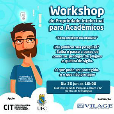 O workshop é realizado pela Vilage Marcas e Patentes e conta com o apoio da Coordenadoria de Inovação Tecnológica da Pró-Reitoria de Pesquisa e Pós-Graduação da UFC.