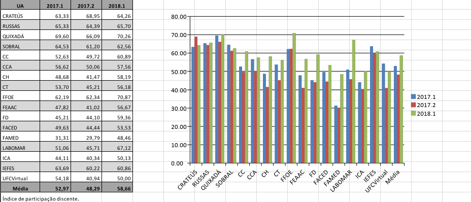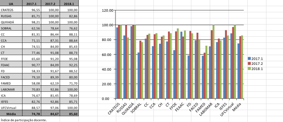 Além disso, outras 10 unidades acadêmicas tiveram pelo menos 80% de participação de professores. Apenas o Campus de Sobral, o Instituto de Cultura e Arte (ICA) e a Faculdade de Medicina (FAMED) tiveram índice abaixo desse percentual. Contudo, a CPA esclareceu que, mesmo assim, a FAMED atingiu seu melhor índice nas últimas avaliações.