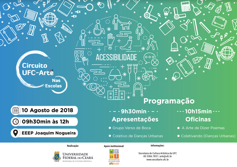 Participam os projetos da UFC Verso de Boca (poesia) e Coletivo de Danças Urbanas (dança), que, além de se apresentarem, também ministrarão oficinas para os alunos. Intérpretes de libras atuarão durante o evento sempre que necessário.