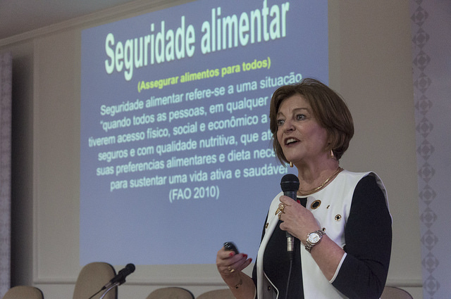 De início, ela detalhou para uma plateia atenta o conceito de seguridade alimentar, cunhado pela Organização das Nações Unidas para a Alimentação e a Agricultura (FAO), em 2010. "No Brasil, chamamos segurança alimentar que é utilizado como um termo bastante amplo que abrange tanto a food safety, que seria alimento seguro, livre de contaminações químicas, físicas ou patológicas, e também abrange a seguridade alimentar que é a garantia de acesso a alimentos com qualidade nutricional mínima para todas as pessoas do mundo, sem exceção", explicou.