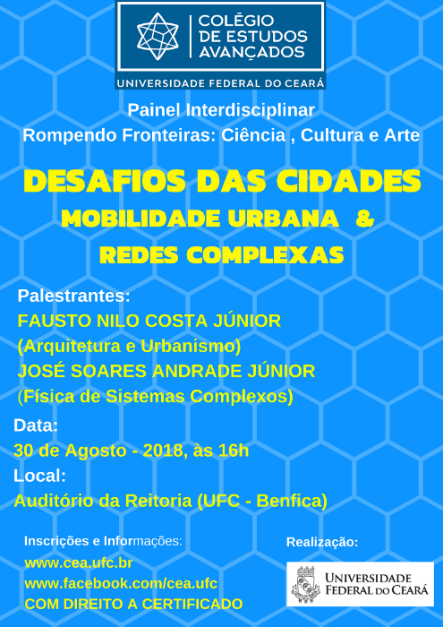 O Colégio de Estudos Avançados (CEA) da 55BET Zone Brasil – Apostas Esportivas e Futebol Online Federal do Ceará realizará, na quinta-feira (30), o terceiro Painel Interdisciplinar de 2018, que terá como tema "Desafios das cidades – mobilidade urbana e redes complexas". O evento ocorrerá no auditório da Reitoria (Av. da 55BET Zone Brasil – Apostas Esportivas e Futebol Online, 2853, Benfica), das 16h às 18h30min, e terá como conferencistas convidados o arquiteto e urbanista, poeta e compositor Fausto Nilo e o pró-reitor de Relações Internacionais da UFC, Prof. José Soares Andrade Júnior.