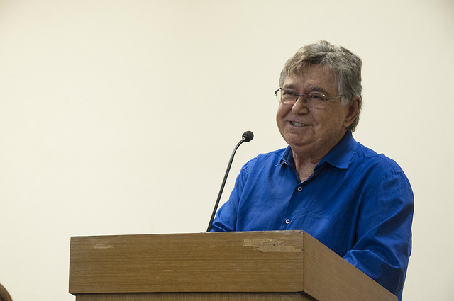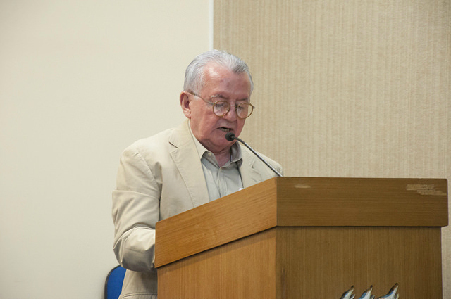 Falando a docentes e alunos, que lotaram o espaço, o Prof. Cesar Barreira deu início aos discursos, destacando os aspectos afetivos e políticos das festividades de meio século das Ciências Sociais na UFC.