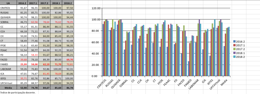 Registraram mais de 90% de participação docente os campi de Crateús (97,5%), Quixadá (94,44%) e Russas (95,92%), assim como as seguintes unidades acadêmicas: Faculdade de Farmácia, Odontologia e Enfermagem – FFOE (98,35%), Centro de Ciências (91,55%), Centro de Tecnologia (92,48%), Centro de Ciências Agrárias (90,23%), Instituto UFC Virtual (94,59%), LABOMAR (92,31%) e FEAAC (90,62%).