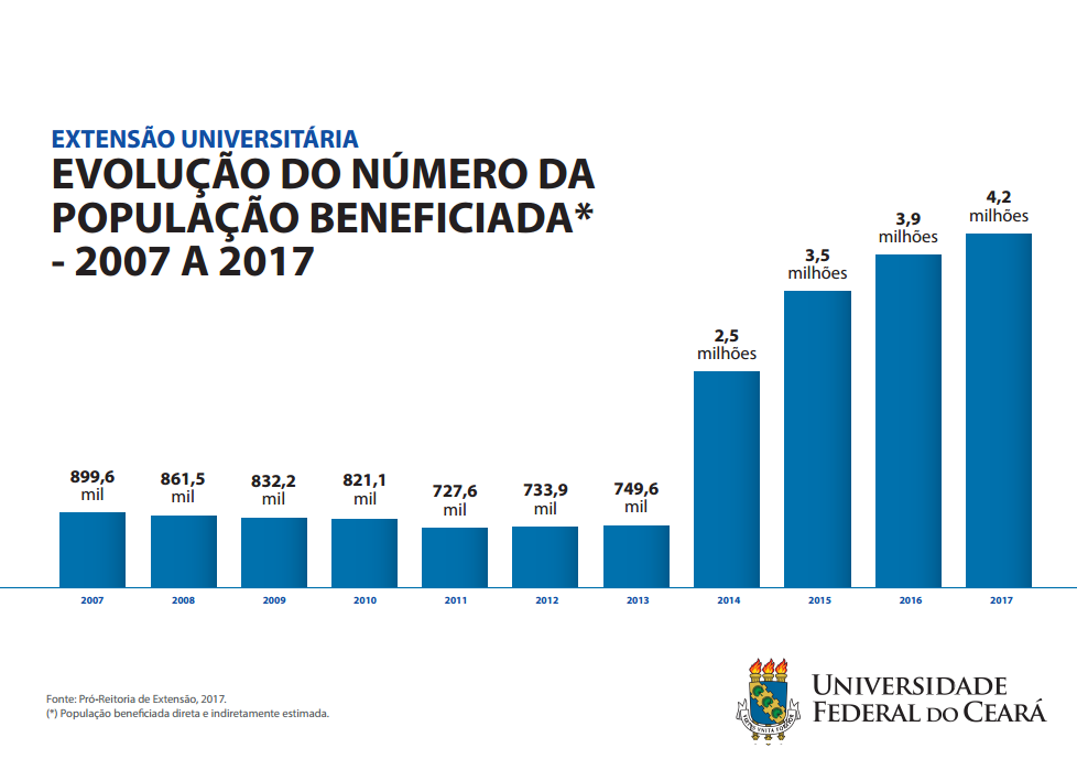 Imagem: gráfico com evolução do número de pessoas alcançadas pelas ações de extensão da UFCCURRICULARIZAÇÃO DA EXTENSÃO – Compreendendo a importância das ações extensionistas, a UFC aprovou, em 2017, resolução que determina que todos os seus cursos de graduação deverão implementar atividades de extensão nos currículos pedagógicos.