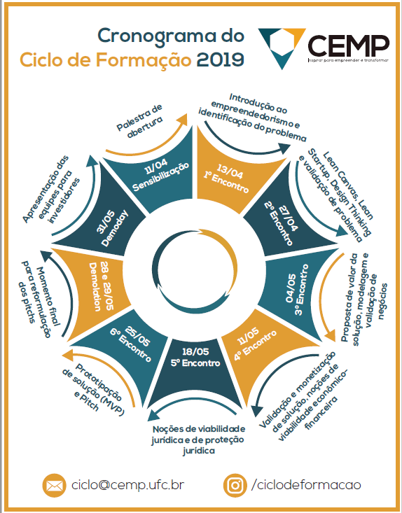 Os participantes do Ciclo de Formação em Empreendedorismo Inovador serão estimulados a formar equipes, idealizar negócios e aprender a transformar ideias em projetos de empreendimento de forma intensiva. Para isso, a cada encontro, eles receberão orientações de especialistas e empreendedores cearenses que apresentarão experiências de sucesso. As equipes com melhores resultados serão incentivadas e orientadas a participar de competições de modelos de negócios e a buscar recursos e apoios por meio de editais de subvenção econômica e de incubadoras e aceleradoras.