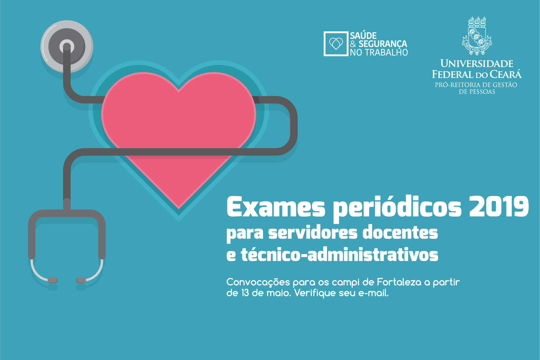 Imagem: arte de divulgação dos exames periódicos com ilustração de um coração e um estetoscópio ao redorServidores docentes e técnico-administrativos dos campi da UFC em Fortaleza que vão participar dos exames periódicos de 2019 devem ficar atentos às datas e locais de coleta dos exames laboratoriais.