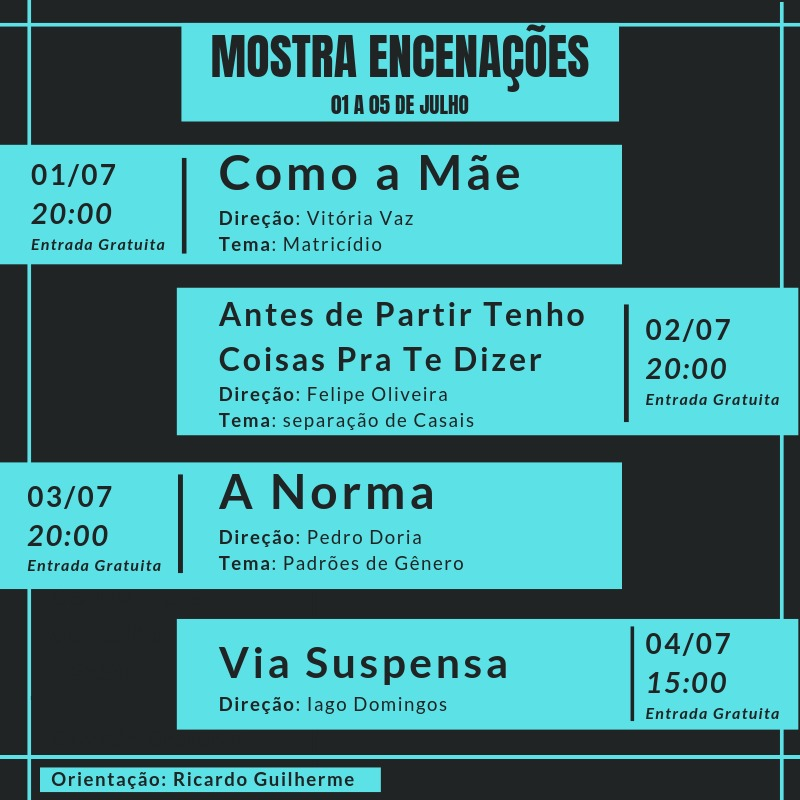 Na quarta (3) e na quinta-feira (4), às 20h, será a vez de A Norma, que retrata os padrões de gênero. Com texto e direção de Pedro Dória, o espetáculo tem Robert Bernardo no elenco e Yanka na iluminação. A última peça da Mostra Encenações é Via Suspensa, que será apresentada na quinta-feira (4), às 15h. Dirigida por Iago Domingos, a peça conta com os atores Henrique Sousa, Lucas Felipe, além de Lucas Sampaio na trilha sonora e orientação de direção do Prof. Tiago Fortes.