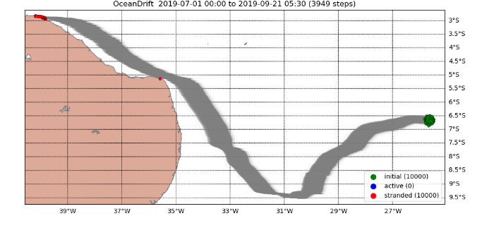 Para dar respaldo ao levantamento histórico, os pesquisadores fizeram então uma simulação numérica computadorizada. Nessa simulação, são liberadas partículas a partir do lugar onde o navio afundou. O resultado mostra que essas partículas chegam exatamente ao litoral nordestino, reforçando a tese de que a antiga embarcação é a fonte das caixas vistas em várias praias desde o fim de 2018.