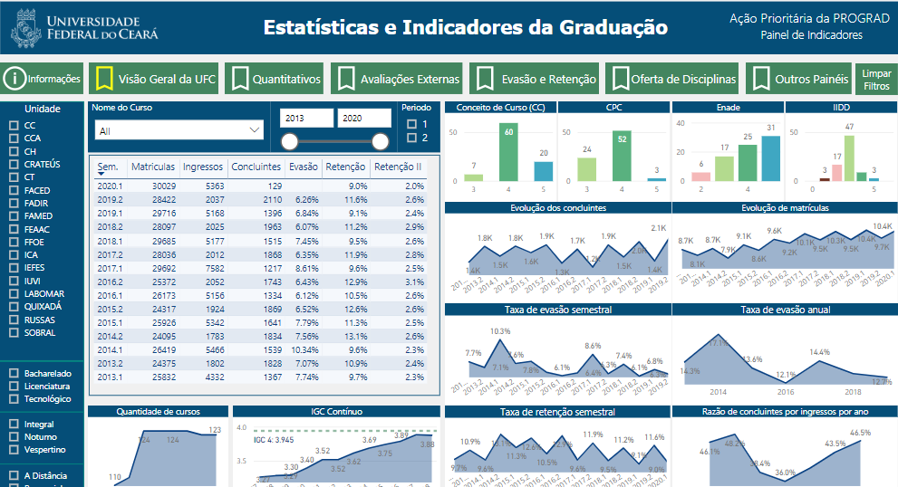 PAINEL DE INDICADORES DA GRADUAÇÃO – Além da pesquisa institucional, uma novidade importante foi lançada nesta semana, pela PROGRAD, para garantir à UFC mais dados confiáveis sobre a situação de seus alunos. Trata-se do Painel de Indicadores da Graduação, um amplo banco de dados que atende às melhores práticas de construção de relatórios analíticos.