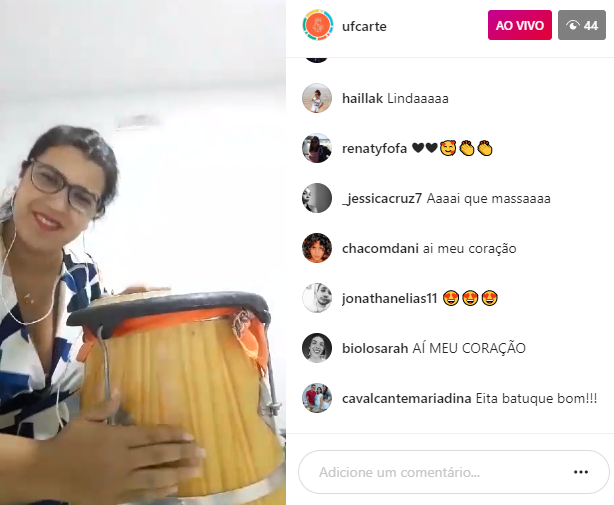 Em uma das oficinas, a realizadora Renata Cavalcante abordou o processo e a prática da produção audiovisual, contando um pouco sobre o métier do produtor e destacando a importância do papel social das produções. Em outro momento, a também professora do Curso de Música Catherine Furtado empolgou os espectadores com uma apresentação sobre música percussiva. "Que a arte possa chegar a vocês através do tambor", desejou. A programação artística segue nesta quinta-feira (21), durante todo o dia, no perfil da SECULT-ARTE no Instagram.