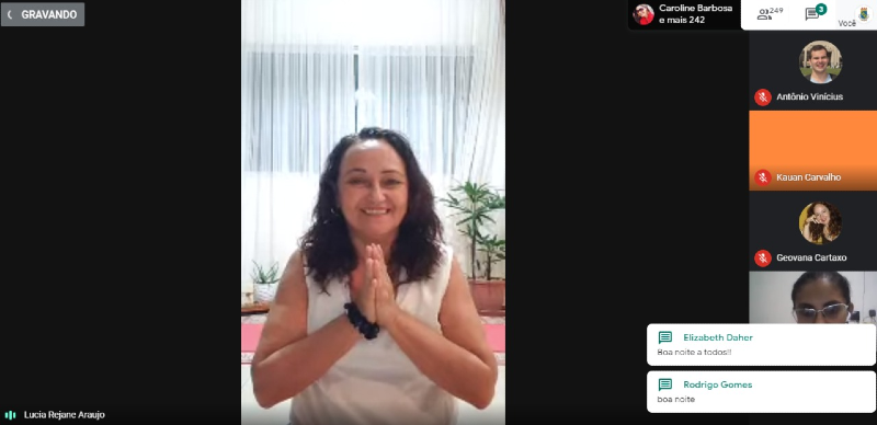 OFICINA – No fim de tarde, os participantes dos Encontros fizeram uma pausa para conferir a oficina de ioga, cuja sala virtual atingiu a capacidade máxima de 250 pessoas. Para a instrutora da oficina, a Profª Lúcia Rejane Barontini, aposentada do Instituto de Educação Física e Esportes (IEFES), a proposta era direcionar uma atividade dinâmica com respiração, relaxamento e posturas corporais com o objetivo de melhorar a qualidade de vida.