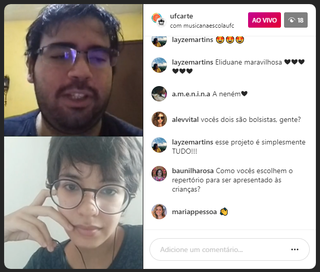 Print da tela de transmissão do InstagramO VI Encontro de Cultura Artística teve a programação deste segundo dia (21) de atividades iniciada com um bate-papo sobre o Projeto Música na Escola, promovido pelo Curso de Música do Campus de Sobral desde 2018. Os estudantes Ben Duarte e Eliduane Ponte Mendes falaram sobre a perspectiva do artista no recital didático, formato de apresentação que o projeto leva às escolas de ensino infantil e fundamental numa parceria com a Secretaria de Educação daquele município.