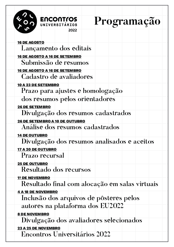 Também em 16 de agosto terão início as submissões de resumos de trabalho pelos autores, com prazo até 16 de setembro. Ajustes e homologação dos resumos pelos respectivos orientadores poderão ser feitos de 19 a 23 de setembro.
